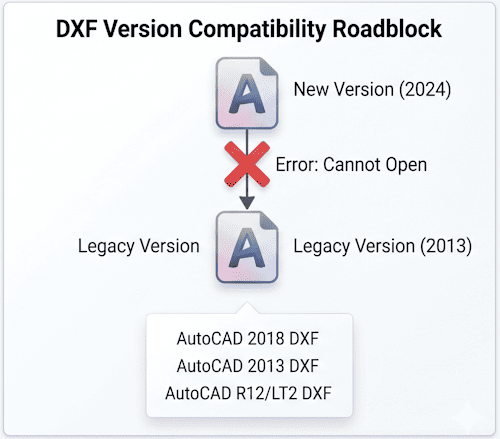This is the most common culprit. DXF files update alongside CAD software releases (e.g., 2018 format, 2013 format, 2004 format). If a vendor exports a DXF from the newest version of AutoCAD and you attempt to open it in older software, the system cannot parse the newer formatting standards, resulting in an immediate read error.
