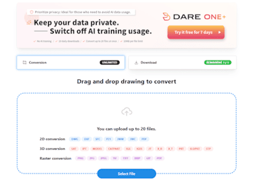 DARE はブラウザだけで DWG・DXF・JWW・PDF などを相互変換・バージョンダウンができる無料サービスです。